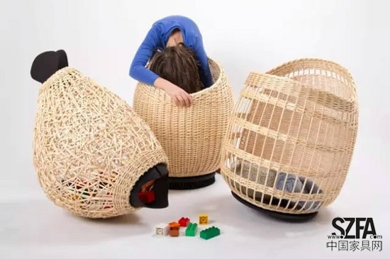 孩子的世界,一半停泊在現(xiàn)實生活中,一半徜徉在想象力的海洋里。對于他們,家具可以像一只飛機(jī),可以是一個籠子,一個陀螺或者一個輪子,無奇不有。由全球頂尖的童裝展會品牌Playtime創(chuàng)辦的PlayWithDesign展邀請了10位設(shè)計師,通過創(chuàng)作這一組用小柳條編織的家具,探索了“移動體驗”的主題。這些打破常規(guī)思維的兒童家具,讓孩子們和家具充分地互動起來,盡情地編織屬于他們的童年玩趣。