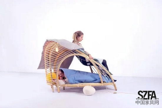 L'emmitoufloir是一個扶手椅,也是一張小床,柳條編織的框架搭成的空間內(nèi)外都可以使用。設(shè)計師為它搭配了柔軟的織物與蛋形的抱枕,在這里可以休息,也可以躲藏起來。