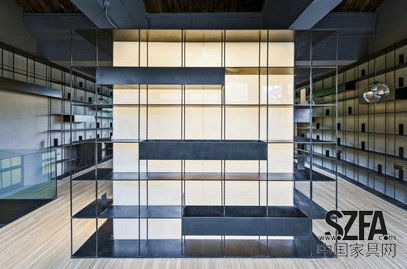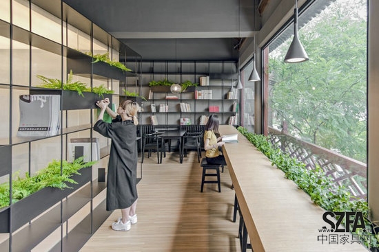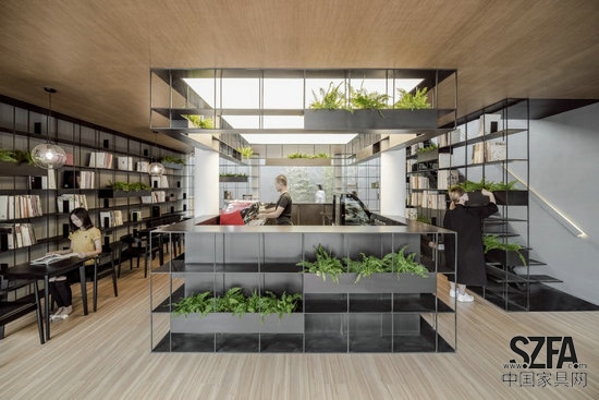 為了改變傳統(tǒng)書店粗重、刻板的形象,新的設(shè)計(jì)利用通透、輕盈的鐵制書架整合功能、交通、設(shè)備與照明,并將綠色植物置入其中,使得新的內(nèi)部空間界面更加連續(xù)開放和富于生機(jī)。