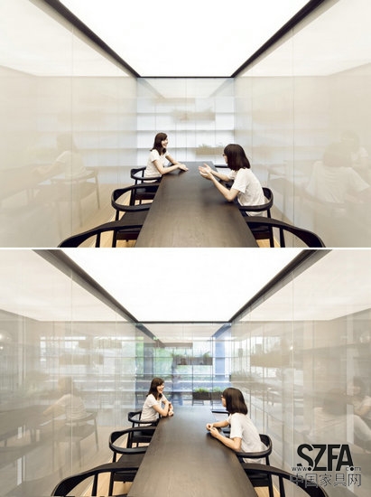 基于建筑原有的柱網(wǎng),室內(nèi)呈現(xiàn)出環(huán)狀的空間結(jié)構(gòu):中央?yún)^(qū)域?yàn)閸u式空間,周邊為鐵制書架墻體。首層中心島做為收銀臺(tái)及咖啡操作臺(tái);二層由調(diào)光玻璃圍合成一個(gè)發(fā)光的盒子作為會(huì)議室。調(diào)光玻璃可改變內(nèi)外的透明狀態(tài),讓會(huì)議室使用更加靈活。中心島通過(guò)軟膜天花形成均勻的整體照明,宛如室內(nèi)的燈籠,而咖啡座則圍繞中心散布于周邊。