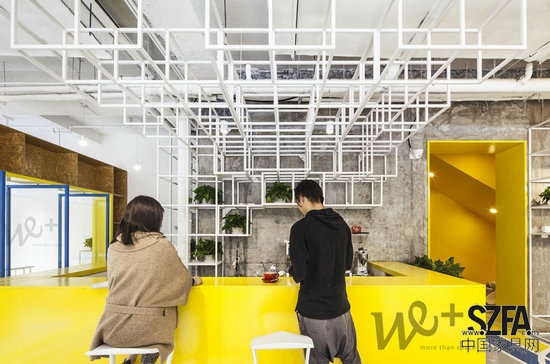 除了“圖書館”式的體驗之外,該聯(lián)合辦公空間還采取了“展覽”的方式進(jìn)行設(shè)計:聯(lián)合辦公空間的入駐者多為創(chuàng)業(yè)階段的中小型團(tuán)隊,團(tuán)隊的產(chǎn)品、發(fā)布、展示、乃至銷售也是進(jìn)行此類空間設(shè)計時需要考慮的功能要求。于是,建筑師在首層植入了四個展示模塊單元和一整面的展示墻為創(chuàng)業(yè)團(tuán)隊提供展示空間。此時,聯(lián)合辦公不僅僅是辦公團(tuán)隊的入駐,也可以是創(chuàng)業(yè)團(tuán)隊產(chǎn)品的入駐。