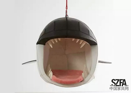 這位設(shè)計(jì)師設(shè)計(jì)了很多款動(dòng)物頭主題的椅子,他保留了動(dòng)物夸張的大頭和縮小的身體,僅僅用一根掛鉤吊在半空中,有點(diǎn)滑稽,但絕對(duì)有趣。因?yàn)檫^于夸張的大嘴,有的時(shí)候不能一眼看出它究竟是什么動(dòng)物,但留有童心的人一定會(huì)去坐一會(huì)兒。