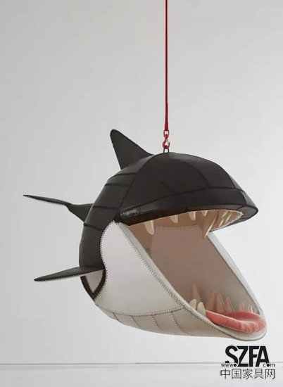 南非的設(shè)計(jì)師 Porky Hefer 在邁阿密設(shè)計(jì)周展出了它的椅子 Fiona Blackfish,一個(gè)張開了嘴的鯊魚頭。鯊魚頭用黑色和白色的皮料拼接,兩側(cè)有魚鰭,后面還背了一個(gè)縮小的尾巴,看起來非??蓯?。嘴中露出了皮質(zhì)的白牙和粉色的舌頭,舌頭也是一個(gè)絨毛墊,可以讓人們坐著或躺在里面。