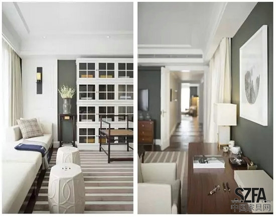 室內(nèi)大部分的家具選擇簡(jiǎn)潔新古典款式,用美國(guó)黑胡桃實(shí)木及酸枝木皮制作,點(diǎn)綴了珍貴大紅酸枝明式家具,如案幾、南宮椅、禪椅及茶桌,少量點(diǎn)綴的中式家具給室內(nèi)帶來(lái)淡淡的人文氣息。