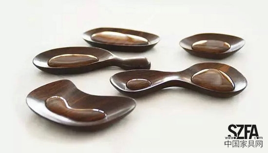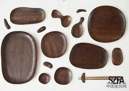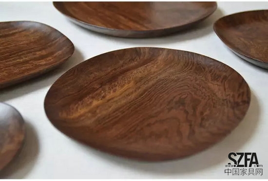該系列的木器制作非常講究,從切料,出坯到打磨,慢慢的一個橢圓盤子制作出來,然后漸漸變得光滑,這個過程就好似一塊方石湍流急下,慢慢被磨去棱角變得光滑而圓潤起來。