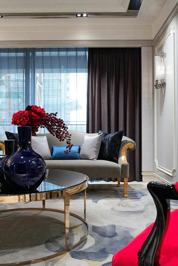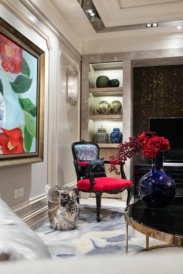 另一處亮點是存在于臥室中華美的景泰藍(lán)茶具以及如墨色般的帷幔,與金銀藝術(shù)品相搭配,點綴如海如晴的自由奔放,在波光瀲滟中呼之欲出的,是對美好生活的向往。