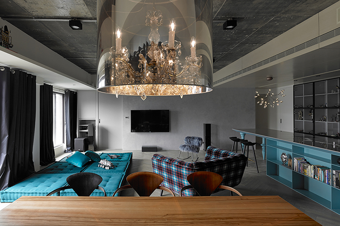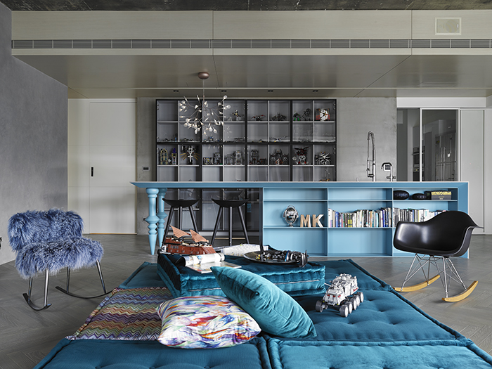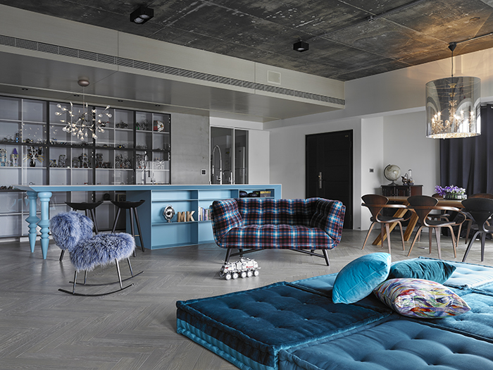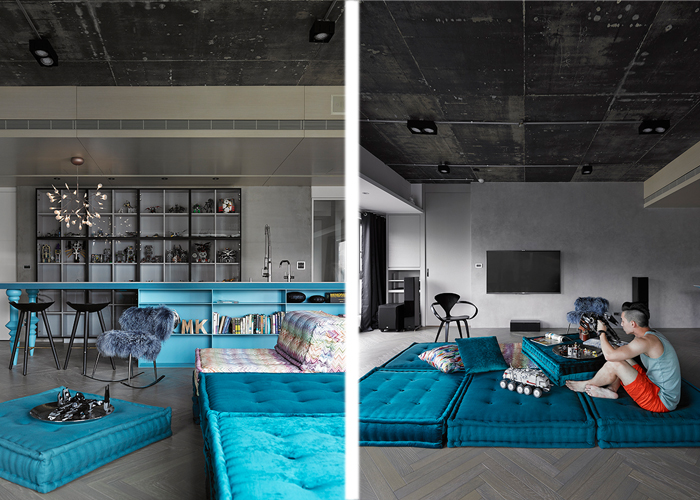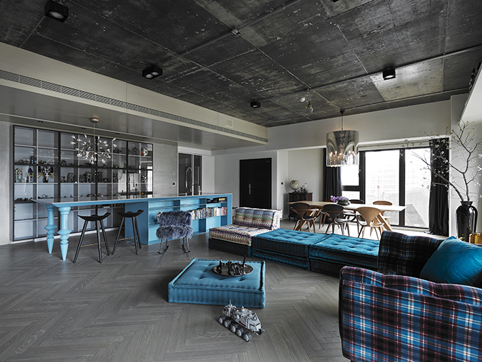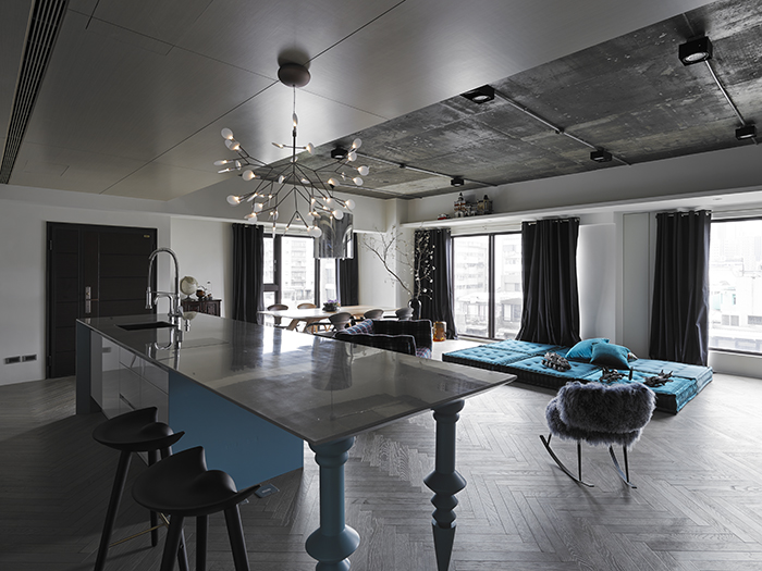 中島吧臺結(jié)合實與虛的訂制概念,臺面下的桌腳賦予書柜、料理和造型,桌腳部分靈感來自西班牙設(shè)計師Jaime Hayon的設(shè)計元素,經(jīng)過設(shè)計師思考后,轉(zhuǎn)換而構(gòu)成造型的細節(jié)表現(xiàn),并挑選一個可跳脫灰白空間的藍綠色更顯矚目。人字形染灰木地板延續(xù)既有水泥材料的灰色調(diào)性,與白色背景相襯。