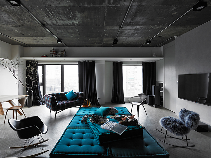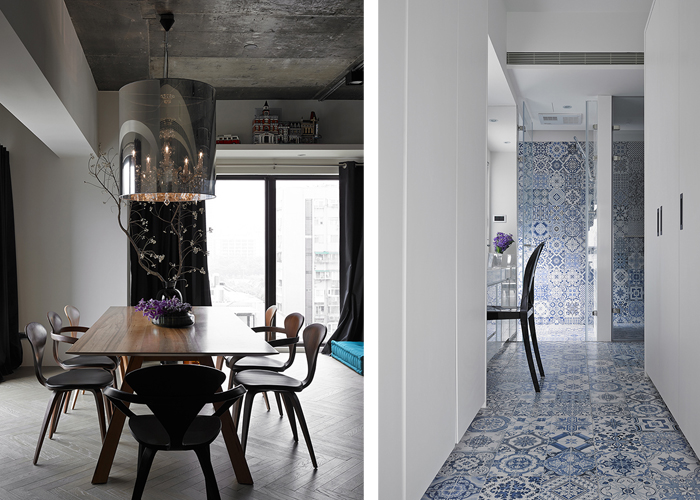 透過水泥的原生特質(zhì),其色彩裝點與家具對象的定調(diào),置入古典圖形的細致元素,經(jīng)由白色背景相連,映襯水泥粉光的主墻意識,跳脫粗獷另一層次。