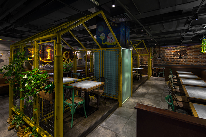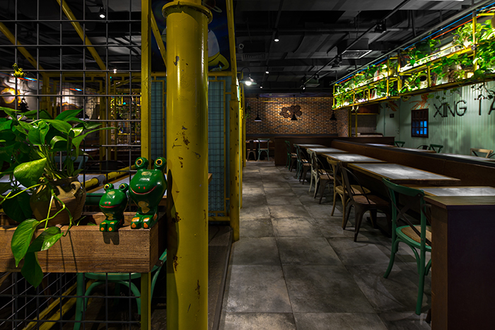 本案位于深圳東門茂業(yè)百貨商場,星炭鍋鍋香主要以提供美味的烤魚為主,而在餐飲業(yè)如雨后春筍般崛起的今天,不得不面臨一種“越來越像”的整體趨勢,其中以工業(yè)風為首要流行風格??爵~餐廳幾乎全部以探魚爐魚為風向標,以鐵通與花磚作為主材,使得其缺少品牌的識別性,淪為沒有個人風格的相似產(chǎn)物。在本案中我們以打造一個“城市綠洲”來塑造一個全新的品牌形象,致力在這喧囂的都市中創(chuàng)造一份寧靜,為消費者打造一片遠離忙碌的心靈棲息之所,給顧客一段舒適的自然時光。