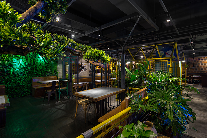 店址位于負一樓,沒有自然采光,層高比較有局限性,為了能實現(xiàn)“城市綠洲”這個主題概念,我們的設計師將餐廳的門頭入口處打造成了一個戶外花園的調(diào)性,抬高門口,就餐者在進入餐廳的那一刻可以放慢了腳步,走進一個慢時光里來,享受空間的趣味性和層次感,錯落有致的綠植,營造出花園里輕松舒適的氛圍,在這里,時光被稀釋了,腳步放慢了,心中的缺失感被填滿了,憂心事忘懷了,給自己一個獨特的空間。