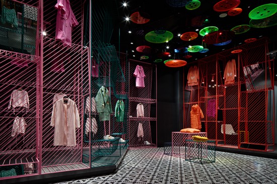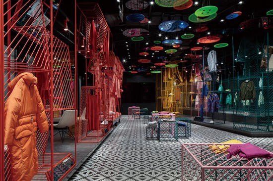 潮女區(qū)大色塊的撞色,由一根根鐵藝曲折而成的彩色貨架,在這個(gè)強(qiáng)調(diào)個(gè)性的空間,利用衣架的前后折度來(lái)分割成雙面掛衣的結(jié)構(gòu),彩色與折線的拼織來(lái)打造幻彩個(gè)性的空間以呼應(yīng)該空間里服裝展現(xiàn)的個(gè)性。設(shè)計(jì)師整合了女裝品牌四大類(lèi)型服裝背后的社會(huì)與文化含義通過(guò)四個(gè)空間的不同的設(shè)計(jì)手法來(lái)演繹了女裝背后的穿衣哲學(xué)并且通過(guò)多種陳列的可能性創(chuàng)造了全新的購(gòu)買(mǎi)體驗(yàn)感。