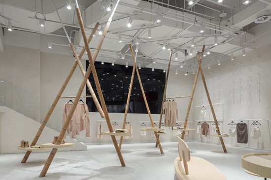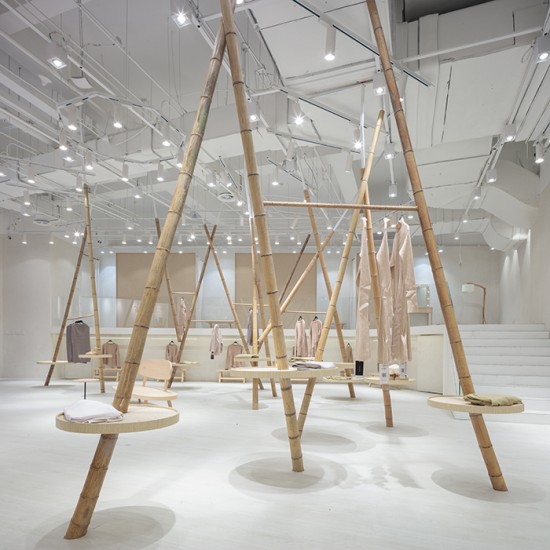 過(guò)主入口區(qū)大大的門(mén)拱,進(jìn)入到森女區(qū)。乳白色肌理墻面,白色地面,一個(gè)潔白干凈的空間,支立著一根根竹竿并以麻繩做連接,而衣架也就此成型。穿衣鏡則隱藏在兩根竹竿的夾角立面上??臻g明亮簡(jiǎn)潔并用古樸的材料來(lái)呼應(yīng)該空間衣服類(lèi)型的氣質(zhì)。