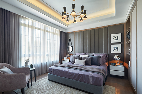 次臥室以淺灰色為主,房間擁有大面積窗景,輕柔的紗窗簾分布床頭兩邊,清閑而臥,十分舒適。主臥色調(diào)稍微強(qiáng)烈一點(diǎn),軟裝上大膽的運(yùn)用了紫色,典雅而不失溫馨。床頭大面積使用軟包,半敞開式衣柜設(shè)計(jì)則兼?zhèn)湔故炯皟?chǔ)藏功能。衛(wèi)生間整體鋪陳非慕斯大理石,從地面延伸至墻面。梳洗臺(tái)柜面運(yùn)用了鏡面設(shè)計(jì),擴(kuò)大了空間的視覺感。