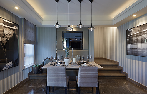 沿著樓梯踏步而上即為一樓的客餐廳,整體設(shè)計(jì)延續(xù)之前的色系,此空間雖然狹小但是功能齊全,墻面鋪貼條紋壁紙,搭配造型優(yōu)雅的燈具,簡潔而大方,現(xiàn)代都市生活氣息撲面而來。餐桌臨窗,并于一邊鋪設(shè)軟包,可倚墻而坐,一邊觀景一邊品鑒美食。