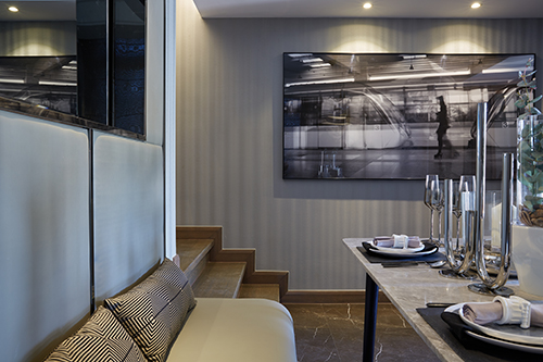 次客廳位于樓梯口,高級(jí)灰的墻面硬包及壁紙鋪陳了整個(gè)空間的基本基調(diào)。金屬分隔條的運(yùn)用則修飾界定了各個(gè)空間,木紋石電視機(jī)墻面與之相呼應(yīng),打破了空間的沉悶。