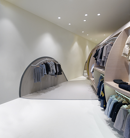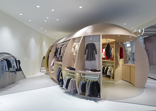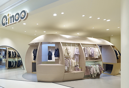 通過(guò)運(yùn)用一個(gè)欲破土而出的巨型“種子”,圓形設(shè)計(jì)憨態(tài)可掬,給人留下深刻的品牌形象,吸引成人與兒童一同走進(jìn)店內(nèi)探索其奧妙。形象鮮明的“種子”不僅在視覺(jué)上引人注目,功能上還融合了展示、銷售、儲(chǔ)藏等。不同人群的不同活動(dòng)模式,如挑選、試衣或者收銀等,被種子元素聯(lián)系起來(lái)。