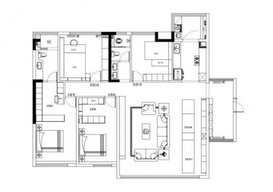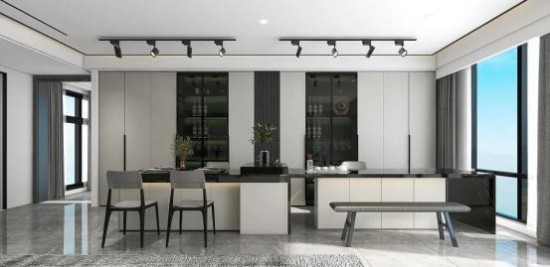 協(xié)調(diào)整體空間比例,客餐廳一體打造通透開(kāi)闊的視覺(jué)效果。選用無(wú)色系的黑白灰鋪染空間氛圍,吊燈處零星分布的射燈點(diǎn)綴,多一份溫柔質(zhì)感。