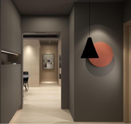 推開(kāi)家門(mén),深淺有致的灰度空間靜雅純粹,別有一番“留白”式藝術(shù)韻味,橘色墻飾與光呼應(yīng),散發(fā)浪漫氣息。隱藏式鞋柜設(shè)計(jì),整潔大氣,節(jié)省空間也便捷生活。