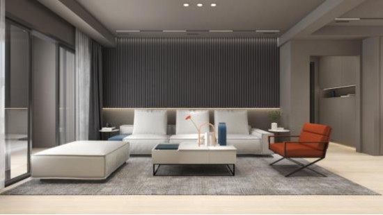 深灰色格柵背景墻內(nèi)設(shè)燈光,提升整體空間的藝術(shù)感與精致度,CBD家居·黑金 | HZ129沙發(fā),米白色舒緩柔和,渲染出愜意而舒適的意境,簡(jiǎn)雅方正的形制,整齊有序的圍合布局,凸顯空間張力,自在倚坐,得靜心閑適。