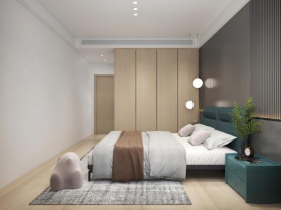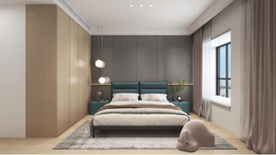 定制柜延續(xù)自然的木色,與莫蘭迪灰背景墻呼應(yīng),主臥空間更顯溫潤(rùn)優(yōu)雅。圓形吊燈如皓月當(dāng)空,增加空間的詩(shī)性,奠定舒緩的睡眠氛圍。