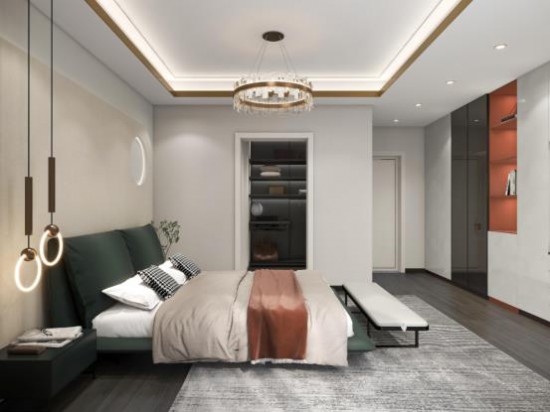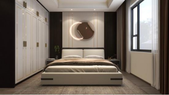 CBD家居·金豹 | J051軟床,橙色床屏包裹米色柔軟靠包,牢固美觀,倚靠享受曼妙的睡前時光。定制衣柜完美解決收納問題,維持空間秩序,生活氣息濃郁。