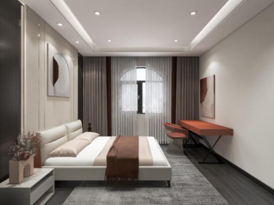 空間整體秉承極簡風的裝飾設計,觀感素雅簡凈,拱形窗戶增強藝術質(zhì)感,呈現(xiàn)淡淡的法式優(yōu)雅,精致感十足。簡易書桌臺靜立于室,豐富空間的功能性。