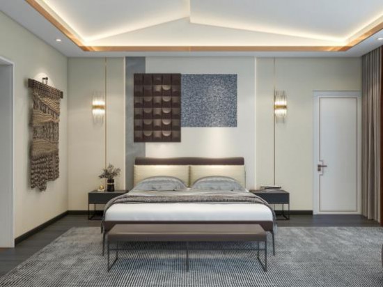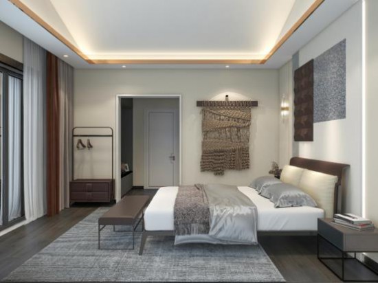 用豐富的設計手法豐富極簡的空間結構,次臥主打灰咖色調(diào),雅致柔和,奠定了舒緩的睡眠氛圍。
