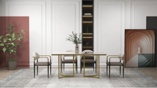 融合金色材質的家具也能呈現出高級的金屬質感,CBD·奢愛家居 | XS001餐臺,潘多拉巖板桌面色澤溫潤,觸感也足夠平滑。